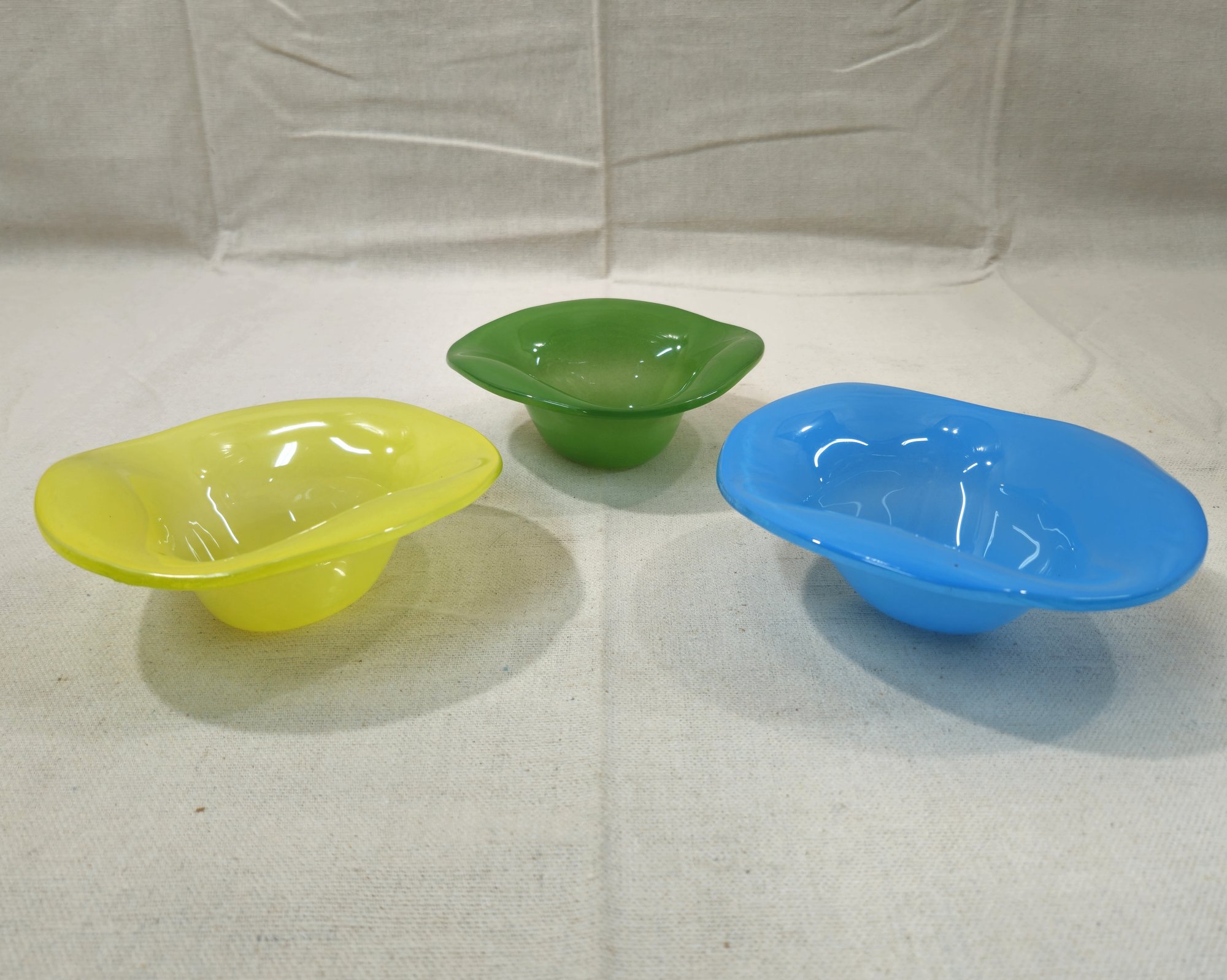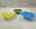 Handblown studio art glass bowl set with a green, yellow, & blue bowl. Signed & numbered on base by annieglass 32/36 USA.