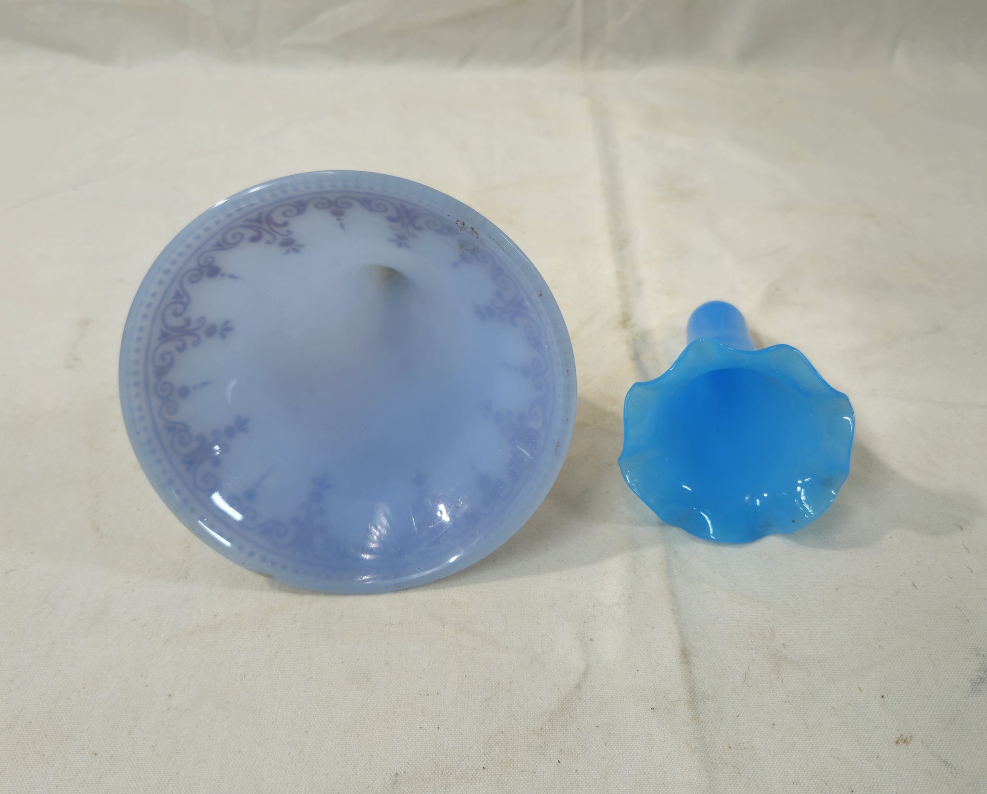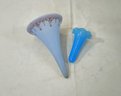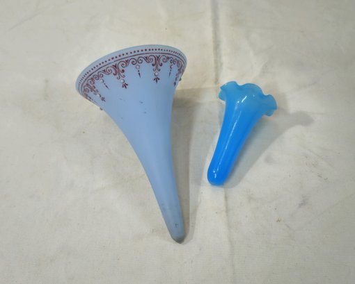 Group of ~2 handblown trumpet vase glass inserts including one with a gauffered rim in a starch blue glass and one decorated with a red enamel decoration around rim in a dull grey-blue glass. Probably both made in Europe.