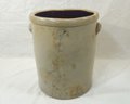 Antique salt glazed with blue script 8-gallon stoneware crock.