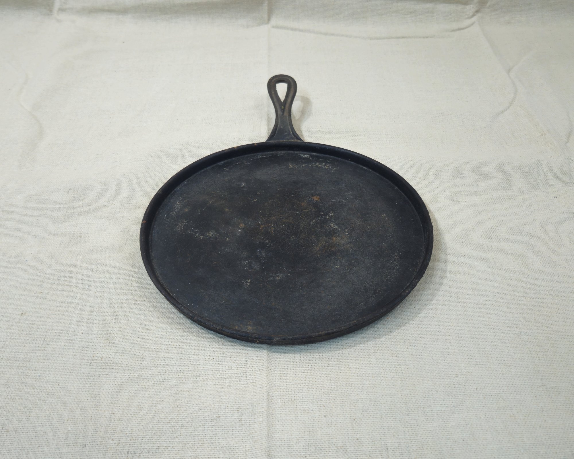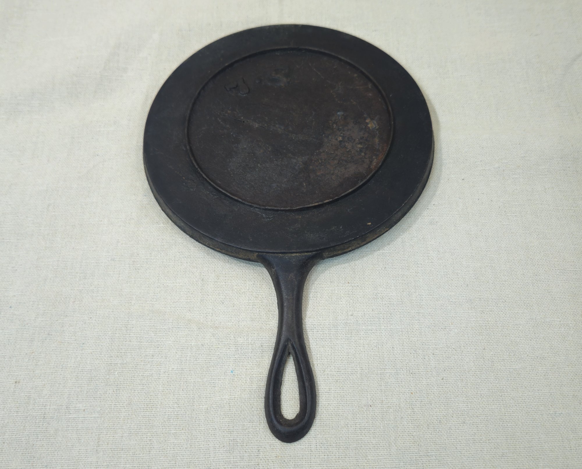 Notes: Antique Cast Iron Round Griddle Pan is pre-owned used condition showing signs of wear commensurate with age & use. Please review pictures.