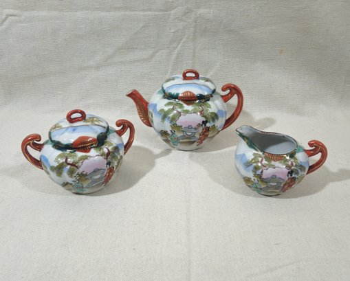 Notes: Antique Takito Hand Painted Geisha Scene Ceramic Teapot, Sugar, & Creamer are pre-owned showing signs of wear commensurate with age & use. Please contact for further condition report or photos.