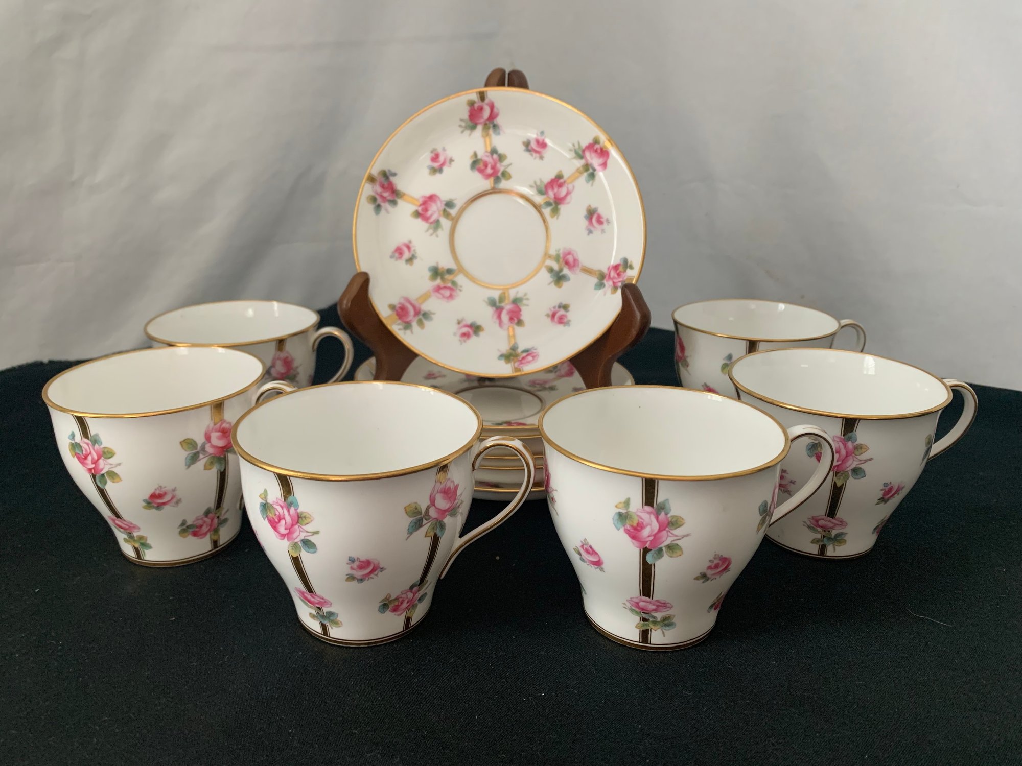 Set of 6 Tiffany & Co. Gold Stripe Roses teacups & saucers including 6 teacups & 6 saucers. Produced by Minton with globe backstamp with added crown.