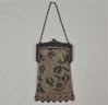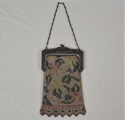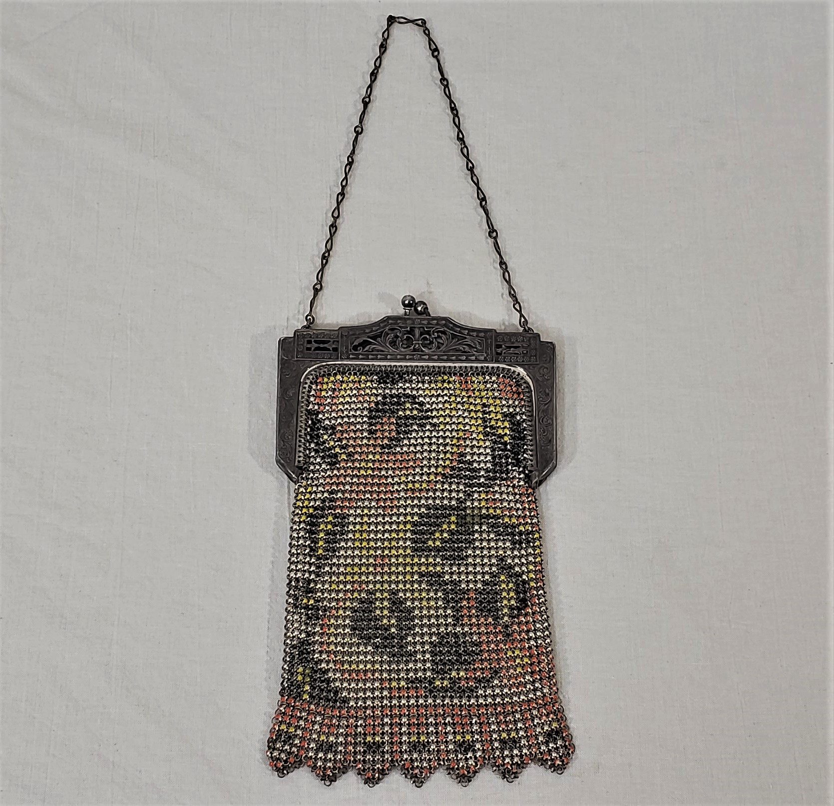 Antique yellow, orange, & black enameled Beadlite mesh purse with floral design. Produced by Whiting & Davis Co.