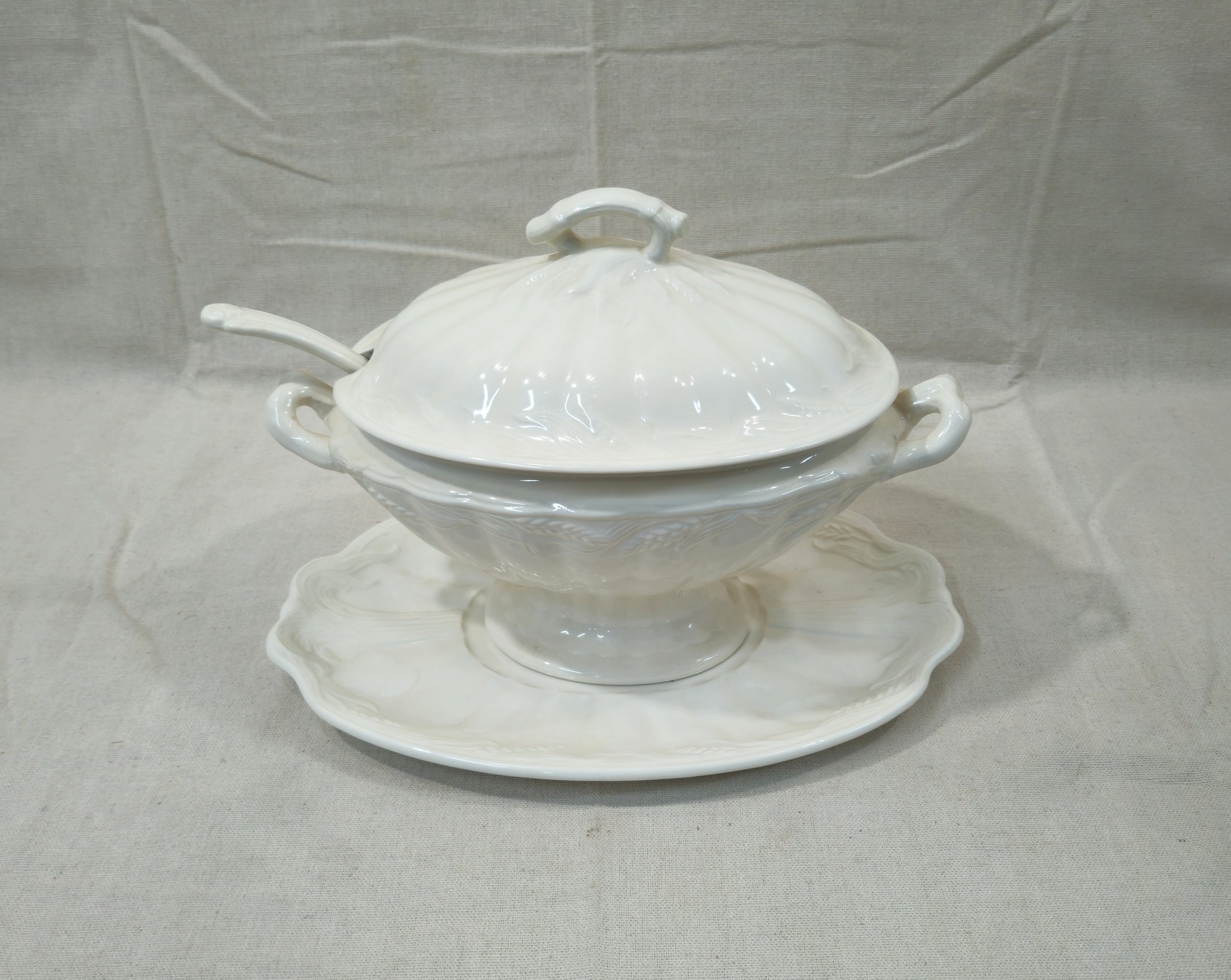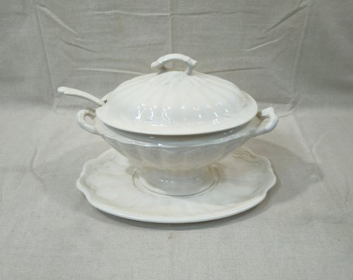 Antique white ironstone covered tureen with underplate, lid, ladle, and a coffee pot with lid. Tureen produced and marked on base underside by Wilkinson Ltd.
