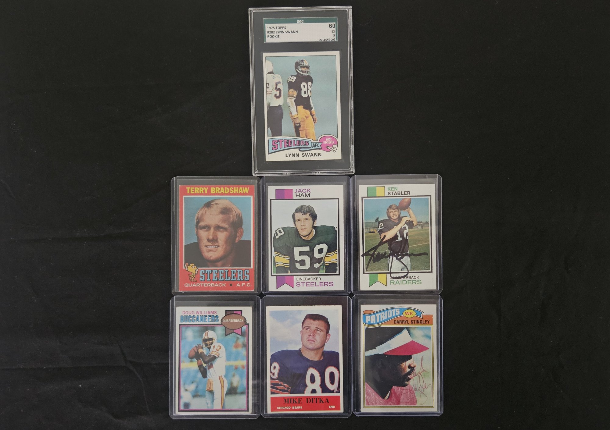 Notes: Assorted 1960/1970'S Rookie & Star Football Sports Cards are pre-owned, Lynn Swan football card graded 60 EX 5 by SGC, 4 remaining football cards are ungraded & in good or better condition, Ken Stabler & Lynn Stingley football card autographs are uncertified, and ungraded football cards secure in penny sleeves in top loaders. Please review pictures.