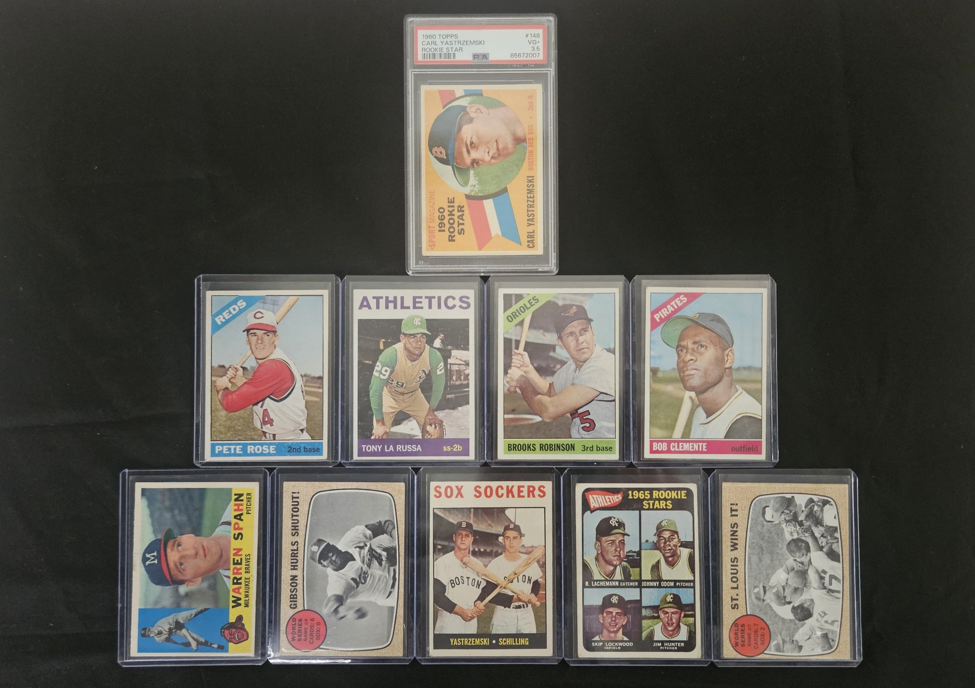 Group of ~10 assorted Topps rookies, stars, and other baseball sports cards including a 1960 Topps #148 Carl Yastrzemski Rookie Star graded VG+ 3.5 by PSA, a 1966 Topps # 30 Pete Rose, a 1964 Topps #244 Tony LaRussa rookie card/ a 1966 Topps #390 Brooks Robinson, a 1966 Topps #300 Roberto Clemente, a 1960 Topps #445 Warren Spahn, a 1968 Topps #154 Gibson Hurls Shutout, a 1968 Topps #157 St. Louis Wins It!, a 1965 Topps #526 Athletics 1965 Rookie Stars with Jim "Catfish" Hunter, and a 1964 Topps #182 Sox Sockers (Yaz/Schilling).