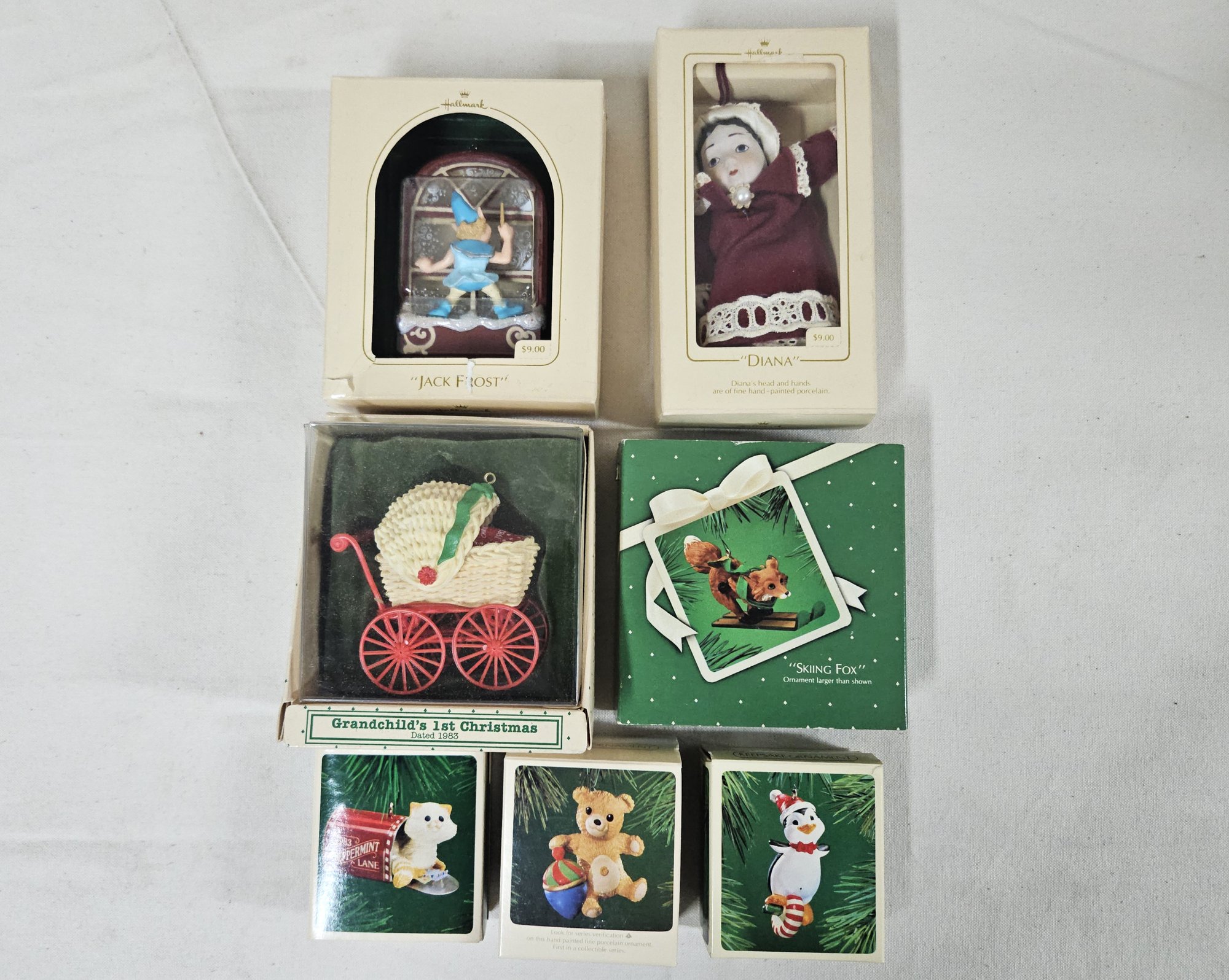 Group of ~7 assorted boxed Keepsake Ornaments including Grandchild's 1st Christmas, Diana, Jack Frost, Skiing Fox, Cinnamon Bear, Mailbox Kitten, & Peppermint Penguin. Produced by Hallmark Cards, Inc.