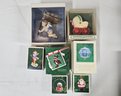 Group of ~7 assorted boxed Keepsake Ornaments including Grandchild's 1st Christmas, The Twelve Days of Christmas Musical Ornament, Caroling Owl, Jolly Santa, Rainbow Angel, Skating Rabbit, & Joyeux Noel. Produced by Hallmark Cards, Inc.