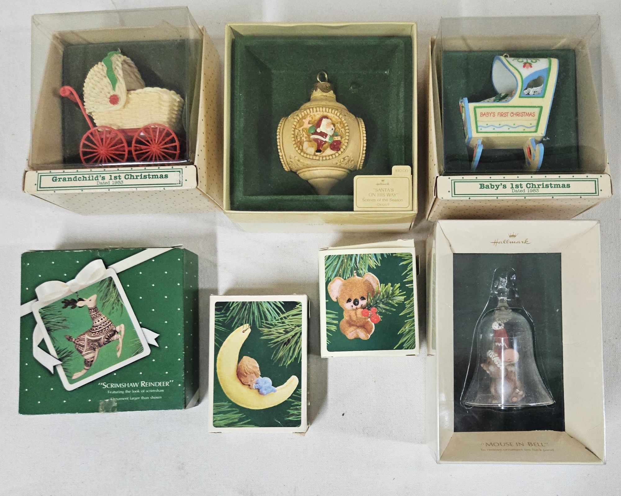 Group of ~7 assorted boxed Keepsake Ornaments including Grandchild's 1st Christmas, Baby's 1st Christmas, Betsey Clark, Christmas Koala, Santa's on his Way, Mouse in Bell & Scrimshaw Reindeer. Produced by Hallmark Cards, Inc.