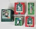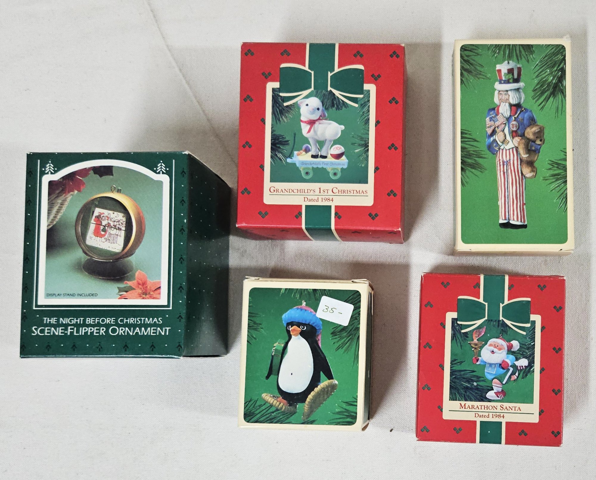 Group of ~5 assorted boxed Keepsake Ornaments including Grandchild's 1st Christmas, Marathon Santa, pressed tin Uncle Sam, The Night Before Christmas Scene-Flipper, & Snowshoe Penguin. Produced by Hallmark Cards, Inc.