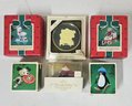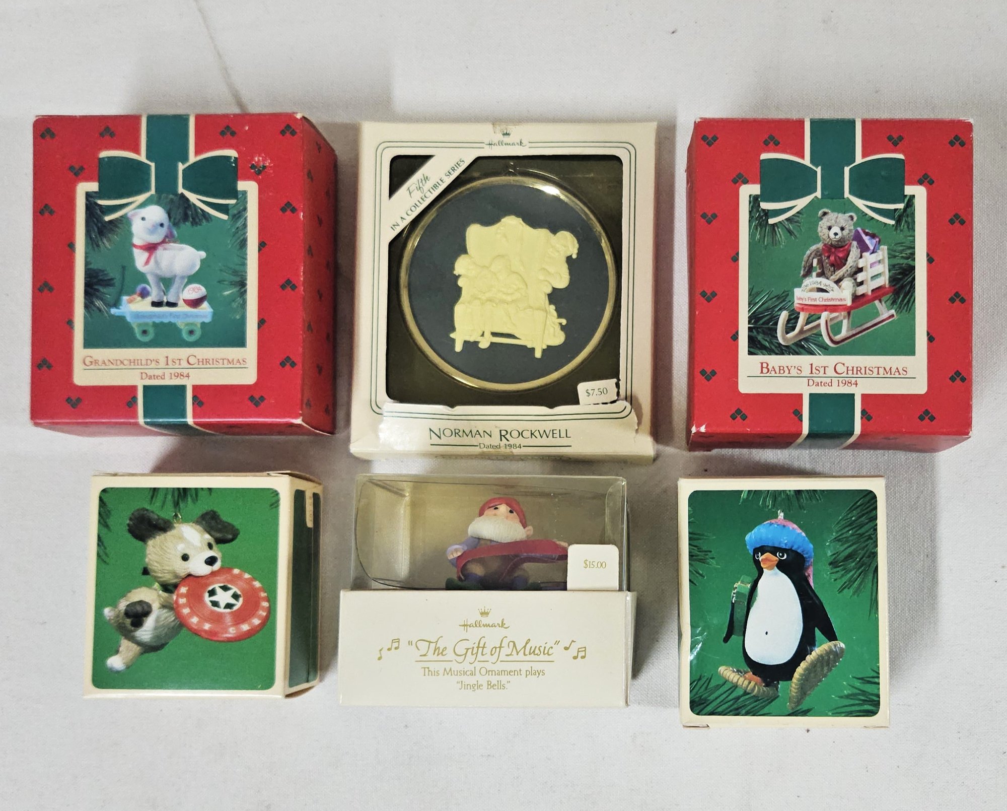 Group of ~6 assorted boxed Keepsake Ornaments including The Gift of Music Jingle Bells, Norman Rockwell, Baby's1st Christmas, Grandchild's 1st Christmas, Frisbee Puppy, & Snowshoe Penguin. Produced by Hallmark Cards, Inc.