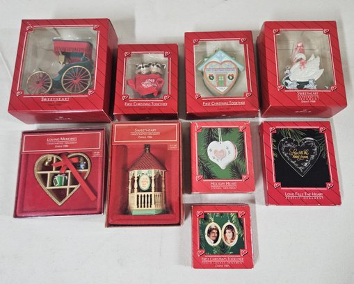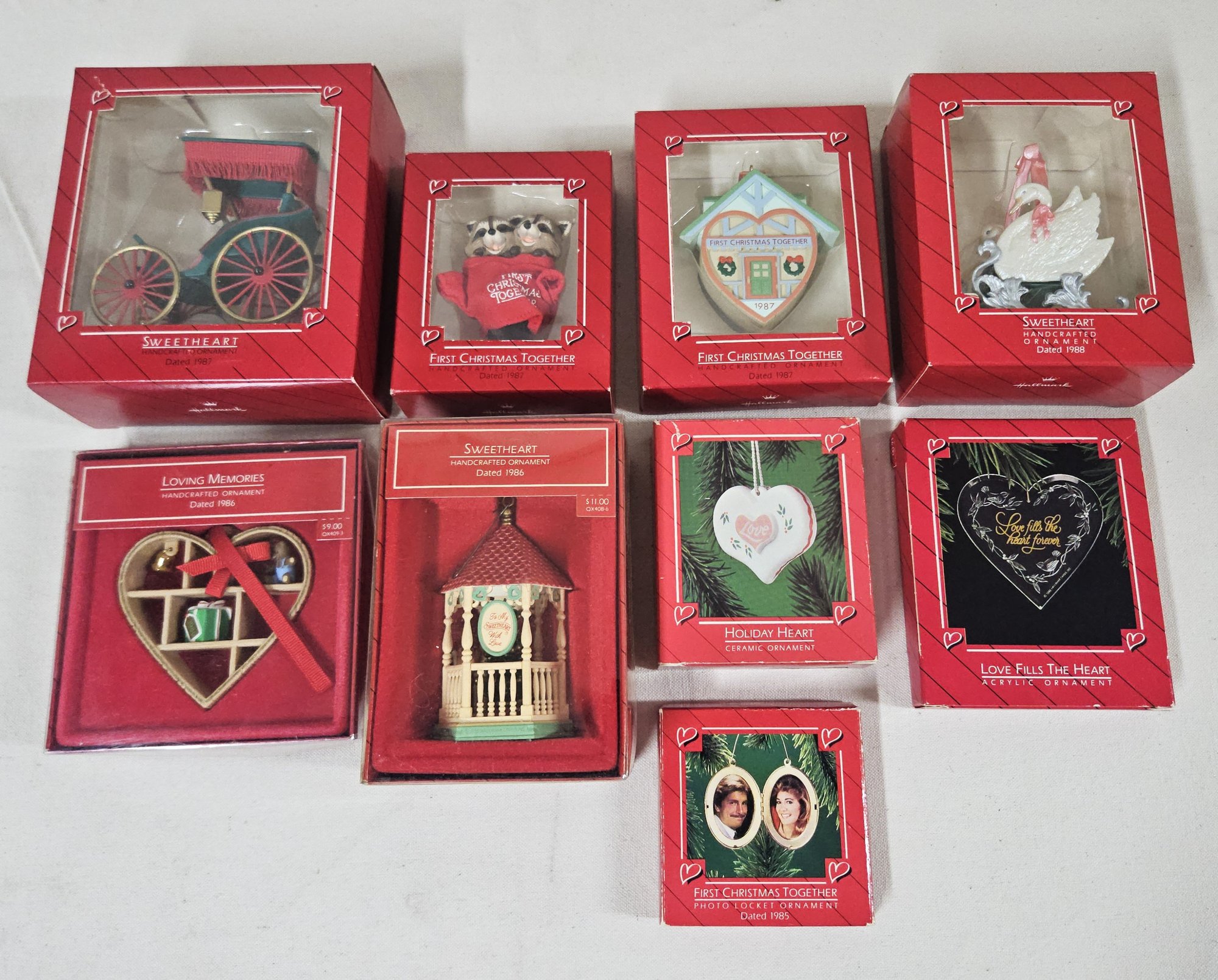 Group of ~9 assorted boxed Keepsake Ornaments including Holiday Heart, 1985 First Christmas Together, Sweetheart, Loving Memories, 1987 First Christmas Together, 1987 First Christmas Together, Sweetheart 1987, Sweeetheart 1988, & Love Fills the Heart. Produced by Hallmark Cards, Inc.