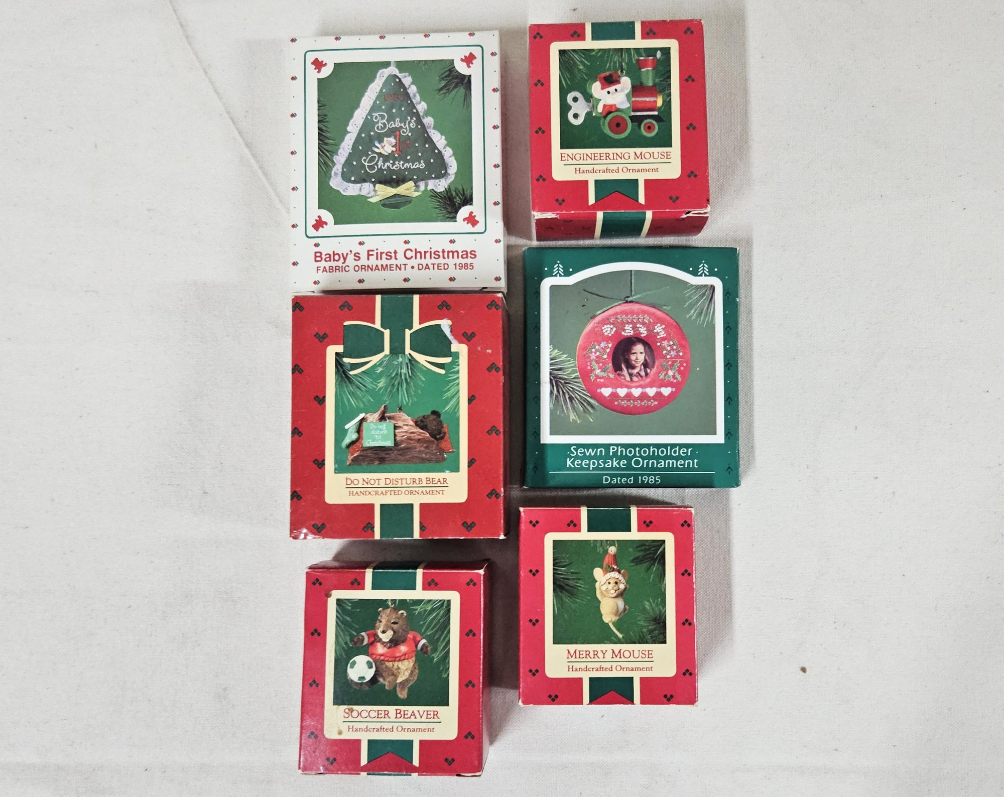 Group of ~6 assorted boxed Keepsake Ornaments including Baby's First Christmas, Merry Mouse, Do Not Disturb Bear, Soccer Beaver, Engineering Mouse, & Sewn Photoholder. Produced by Hallmark Cards, Inc.