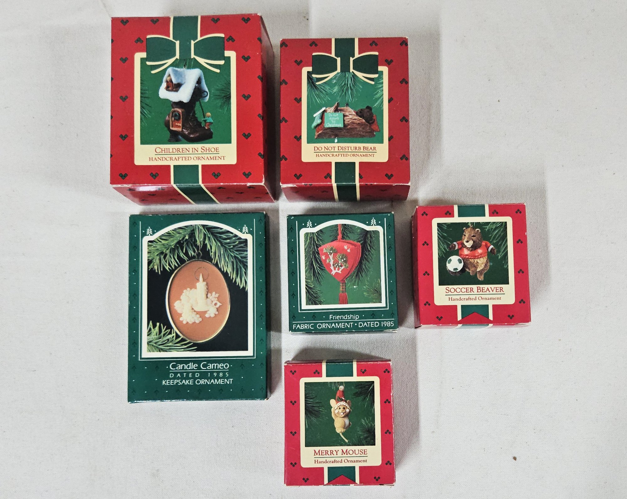 Group of ~6 assorted boxed Keepsake Ornaments including Children in Shoe, Do Not Disturb Bear, Friendship, Soccer Beaver, Merry Mouse, & Candle Cameo. Produced by Hallmark Cards, Inc.