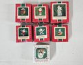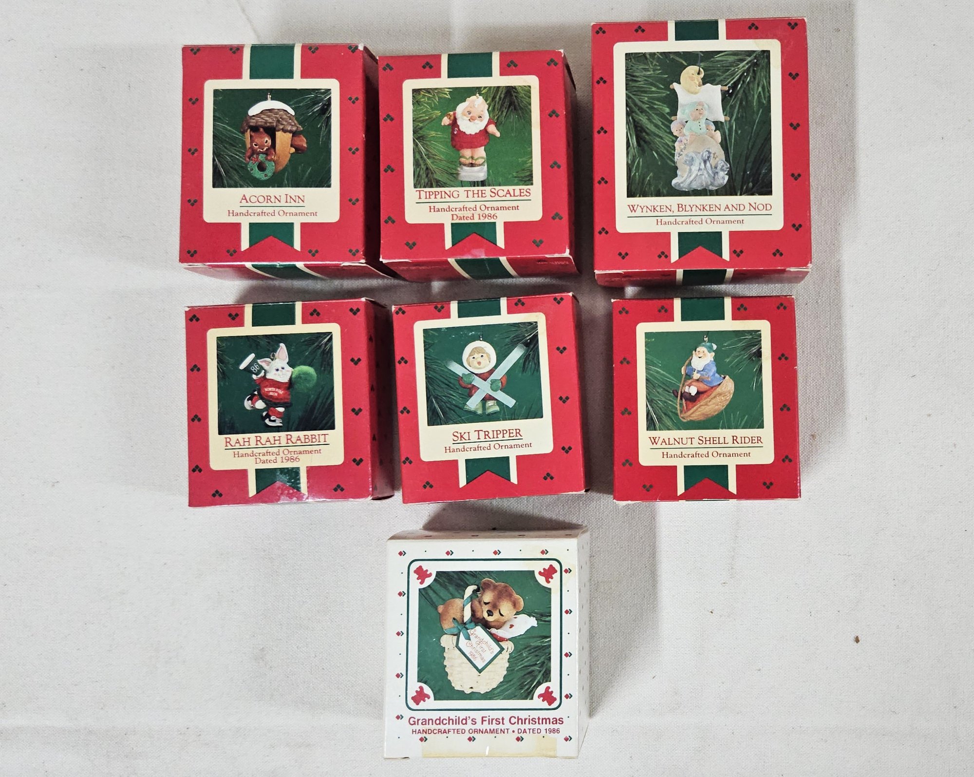 Group of ~7 assorted boxed Keepsake Ornaments including Tipping the Scales, Walnut Shell Rider, Ski Tripper, Acorn Inn, Wyken, Blynken, and Nod, Rah Rah Rabbit, & Grandchild's 1st Christmas. Produced by Hallmark Cards, Inc.