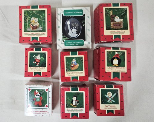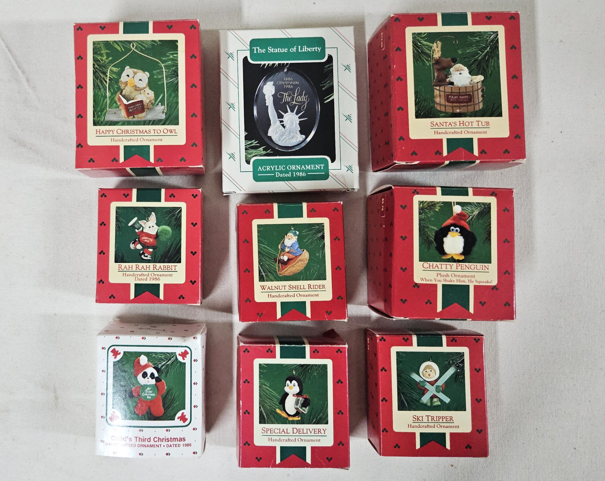 Group of ~9 assorted boxed Keepsake Ornaments including Walnut Shell Rider, Ski Tripper, Rah Rah Rabbit, Child's 3rd Christmas, Chatty Penguin, Happy Christmas to Owl, Santa's Hot Tub, Special Delivery, The Statue of Liberty. Produced by Hallmark Cards, Inc.