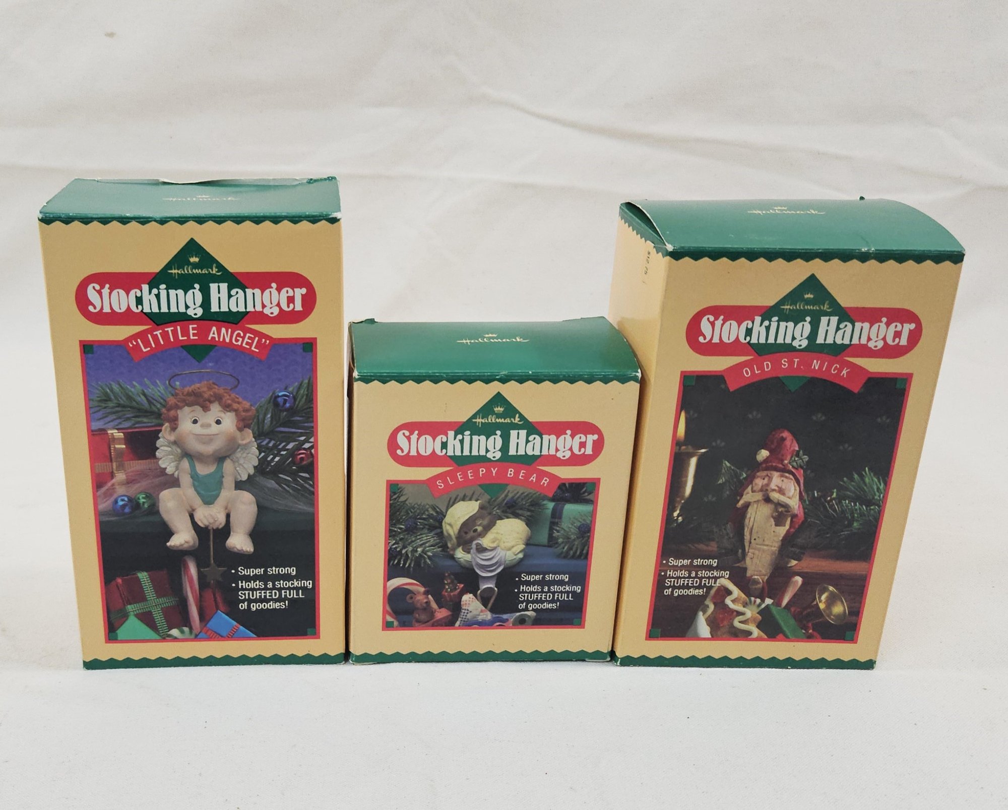 Group of ~3 assorted boxed stocking hangers including Sleepy Bear, Little Angel, & Old St. Nick. Produced by Hallmark Cards, Inc.