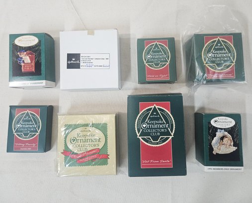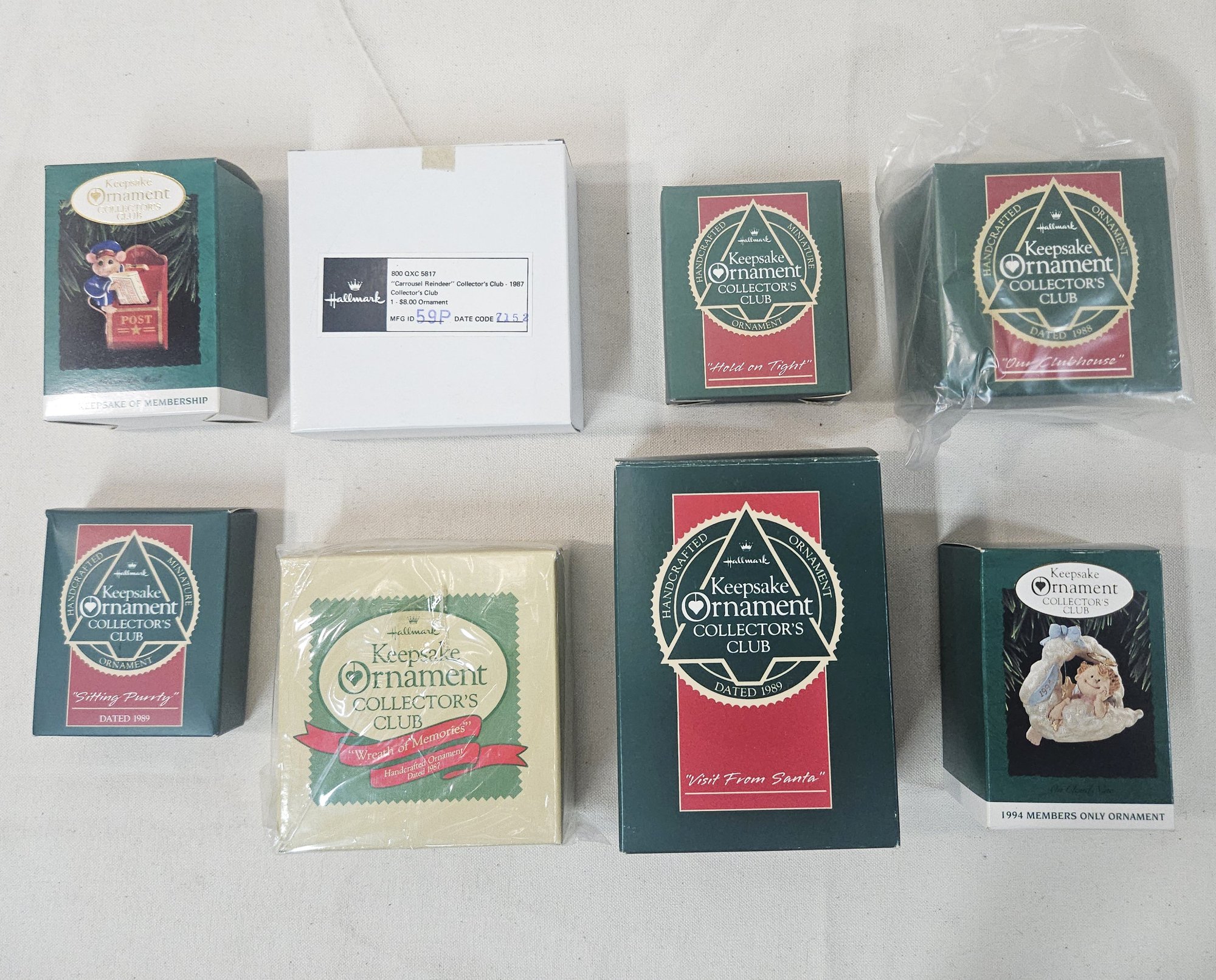 Group of ~8 assorted boxed Keepsake Ornaments Collector's Club ornaments including Carousel Reindeer, Wreath of Memories, Our Clubhouse, Hold on Tight miniature, Sitting Purrty, Visit from Santa, It's in the Mail, & On Cloud Nine. Produced by Hallmark Cards, Inc.