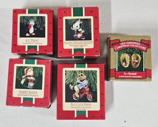 Group of ~5 assorted boxed Keepsake Ornaments including Jogging Through the Snow, Icy Treat, In a Nutshell, Sleepy Santa, & Raccoon Biker. Produced by Hallmark Cards, Inc.