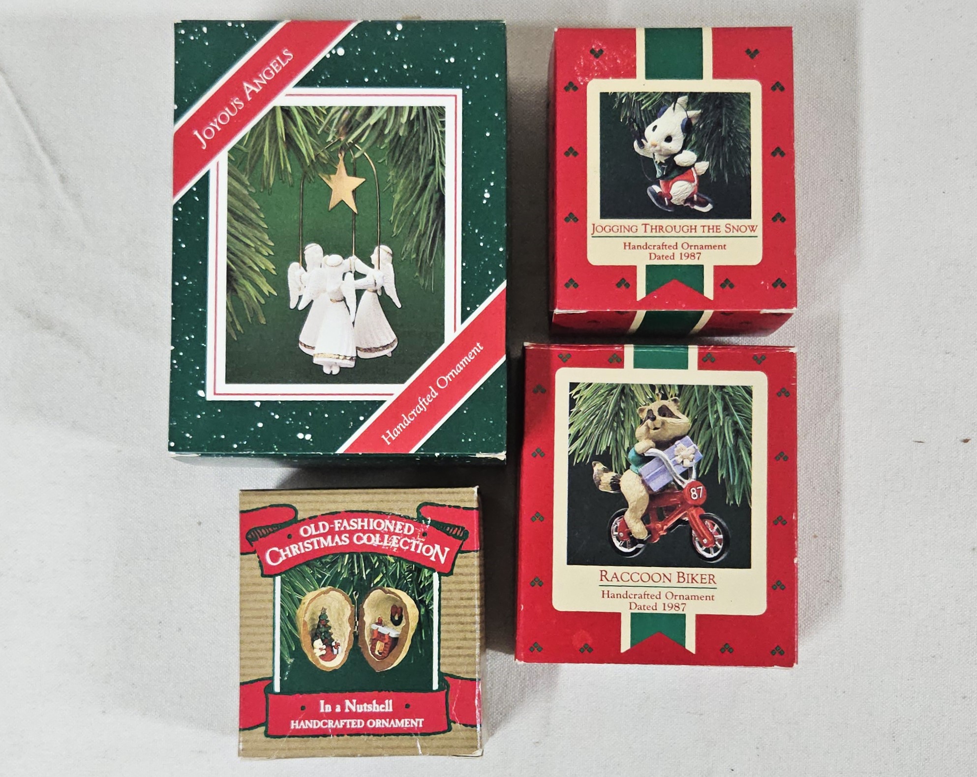 Group of ~4 assorted boxed Keepsake Ornaments including Jogging Through the Snow, In a Nutshell, Joyous Angels, & Raccoon Biker. Produced by Hallmark Cards, Inc.