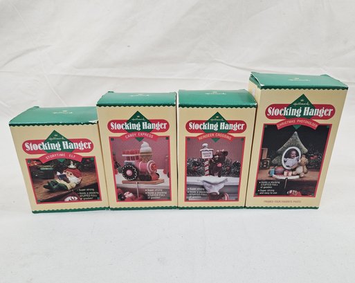 Group of ~4 assorted boxed stocking hangers including Storytime Elf, Candy Express, Reindeer Crossing, & Christmas Photoholder. Produced by Hallmark Cards, Inc.