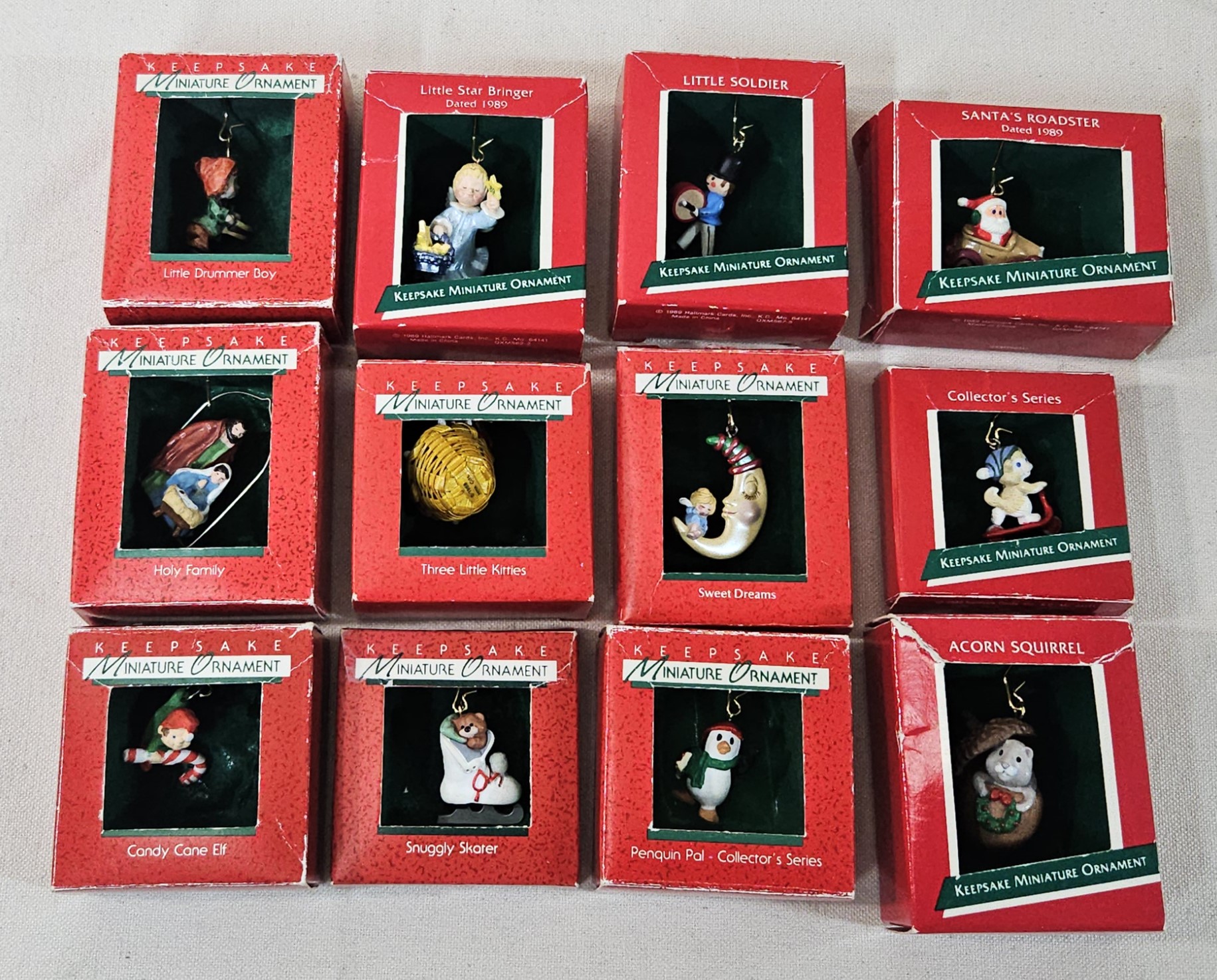 Notes: Assorted 1988/1989 Hallmark Keepsake Miniature Ornaments are pre-owned showing light to minor/moderate signs of wear commensurate with age & use, ornaments retain original boxes, boxes may have some light to heavy blemishes or flaws, and ornaments have no major apparent identifiable blemishes or flaws. Please review pictures.