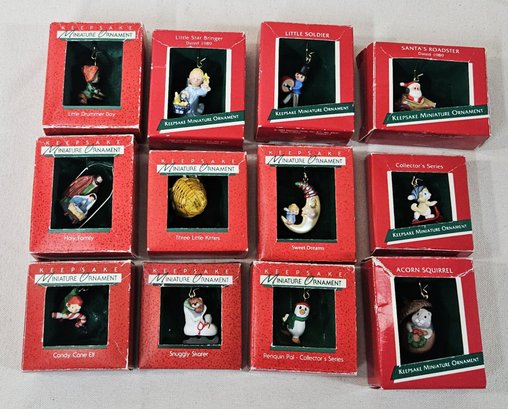 Group of ~12 assorted boxed Hallmark Keepsake Miniature Ornaments including Little Drummer Boy, Little Star Bringer, Little Soldier, Santa's Roadster, Holy Family, Three Little Kitties, Sweet Dreams, Candy Cane Elf, Snuggly Skater, Collector's Series Penguin Pal, Acorn Squirrel, & Collector's Series Kittens in Toyland. Produced by Hallmark Cards, Inc.