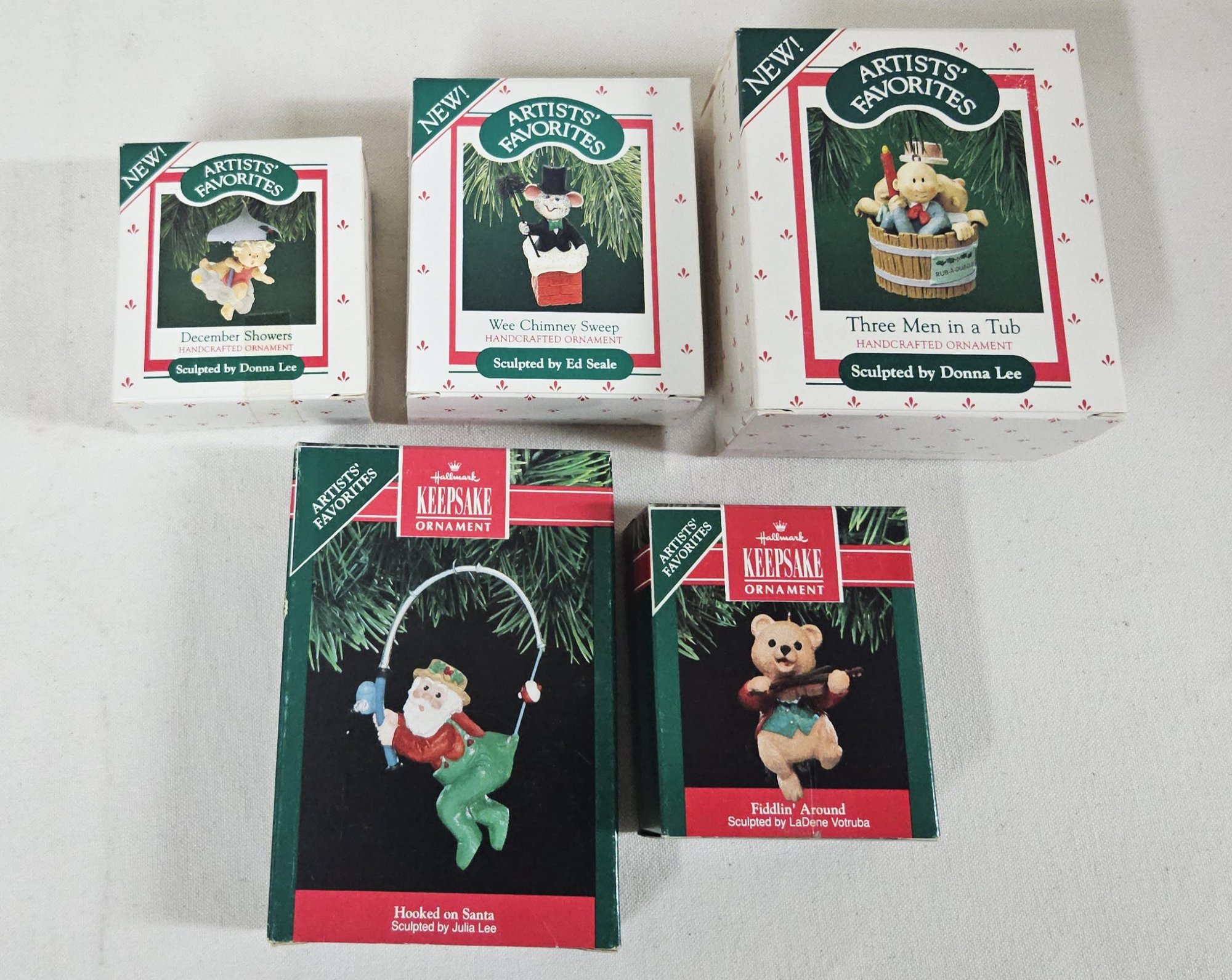 Group of ~5 assorted boxed Keepsake Artists' Favorites including Wee Chimney Sweep, Three Men in a Tub, December Showers, Fiddlin' Around, & Hooked on Santa. Produced by Hallmark Cards, Inc.