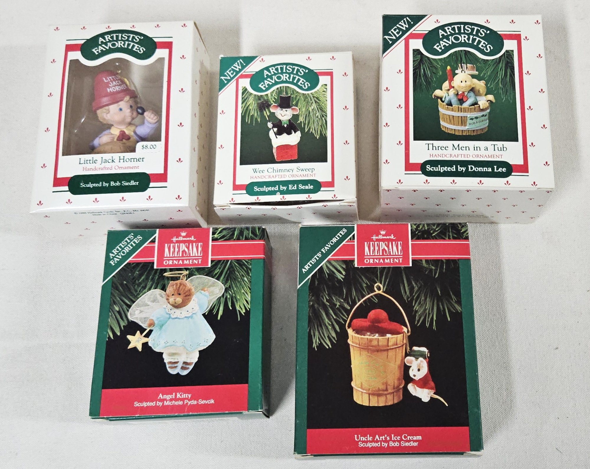 Group of ~5 assorted boxed Keepsake Artists' Favorites including Little Jack Horner, Wee Chimney Sweep, Three Men in a Tub, Angel Kitty, & Uncle Art's Ice Cream. Produced by Hallmark Cards, Inc.