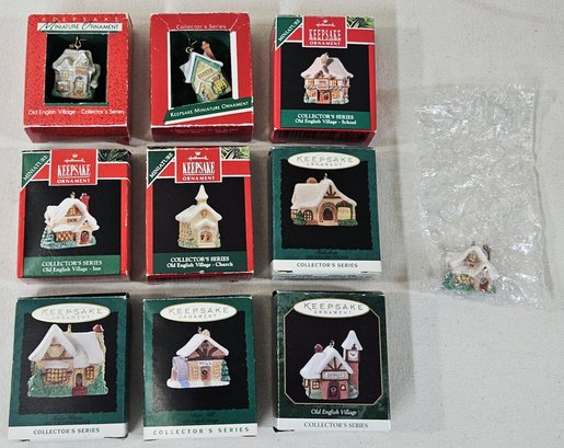 Group of ~10 assorted boxed Hallmark Keepsake Collector's Series Old English Village Miniature Ornaments including 1-10. Produced by Hallmark Cards, Inc.