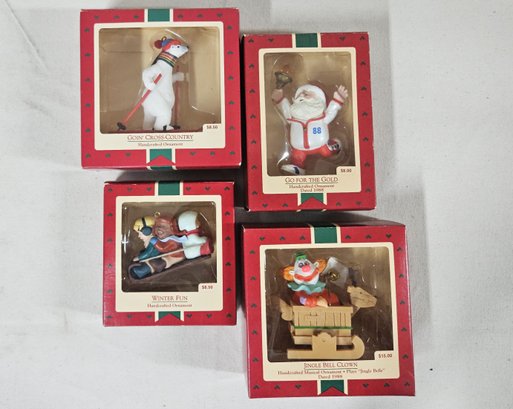 Group of ~4 assorted boxed Keepsake Ornaments including Goin' Cross Country, Go for the Gold, Winter Fun, & Jingle Bell Clown. Produced by Hallmark Cards, Inc.