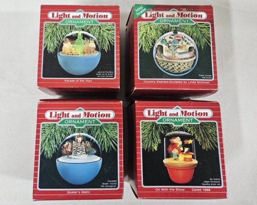 Group of ~4 boxed Keepsake Magic Ornaments including On With the Show, Country Express, Skater's Waltz, & Parade of the Toys. Produced by Hallmark Cards, Inc.
