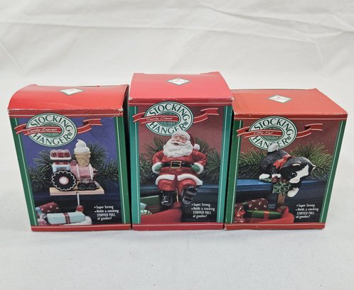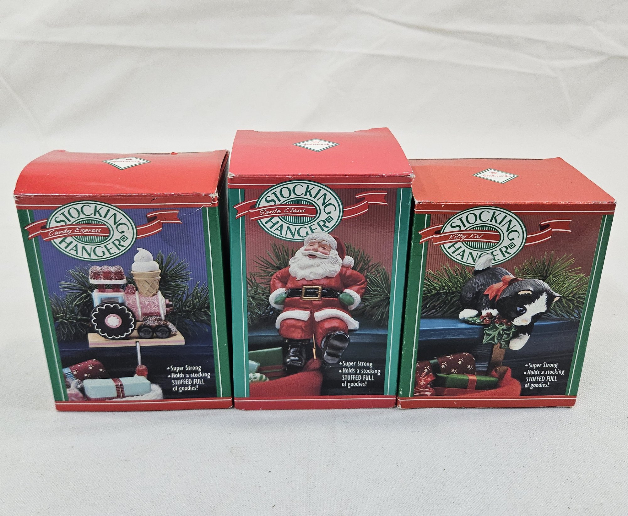 Group of ~3 assorted boxed stocking hangers including Santa Claus, Candy Express, & Kitty Kat. Produced by Hallmark Cards, Inc.
