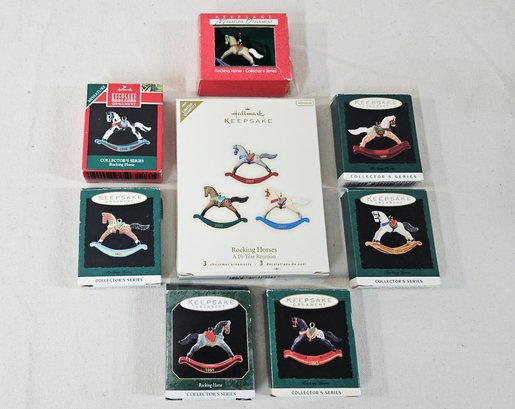 Group of ~8 assorted boxed Hallmark Keepsake Collector's Series Rocking Horse Miniature Ornaments including 2, 3, 6-10, and A 10-Year Reunion. Produced by Hallmark Cards, Inc.
