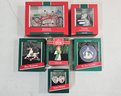 Group of ~6 assorted boxed Keepsake Ornaments including Teacher, Nutshell Workshop, Country Angel, Sweetheart, Horse Weathervane, & The First Christmas. Produced by Hallmark Cards, Inc.