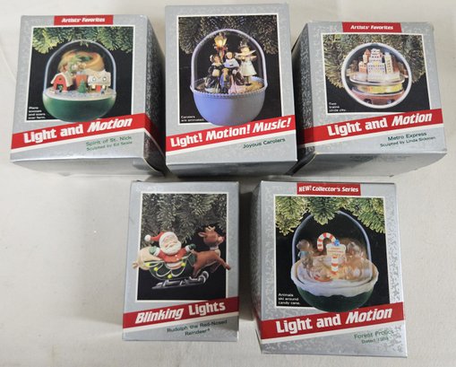 Group of ~5 boxed Keepsake Magic Ornaments including Rudolph the Red-Nosed Reindeer, Collector's Series Forest Frolics, Artists' Favorites Metro Express, Joyous Carolers, & Artists' favorites Spirit of St. Nick. Produced by Hallmark Cards, Inc.