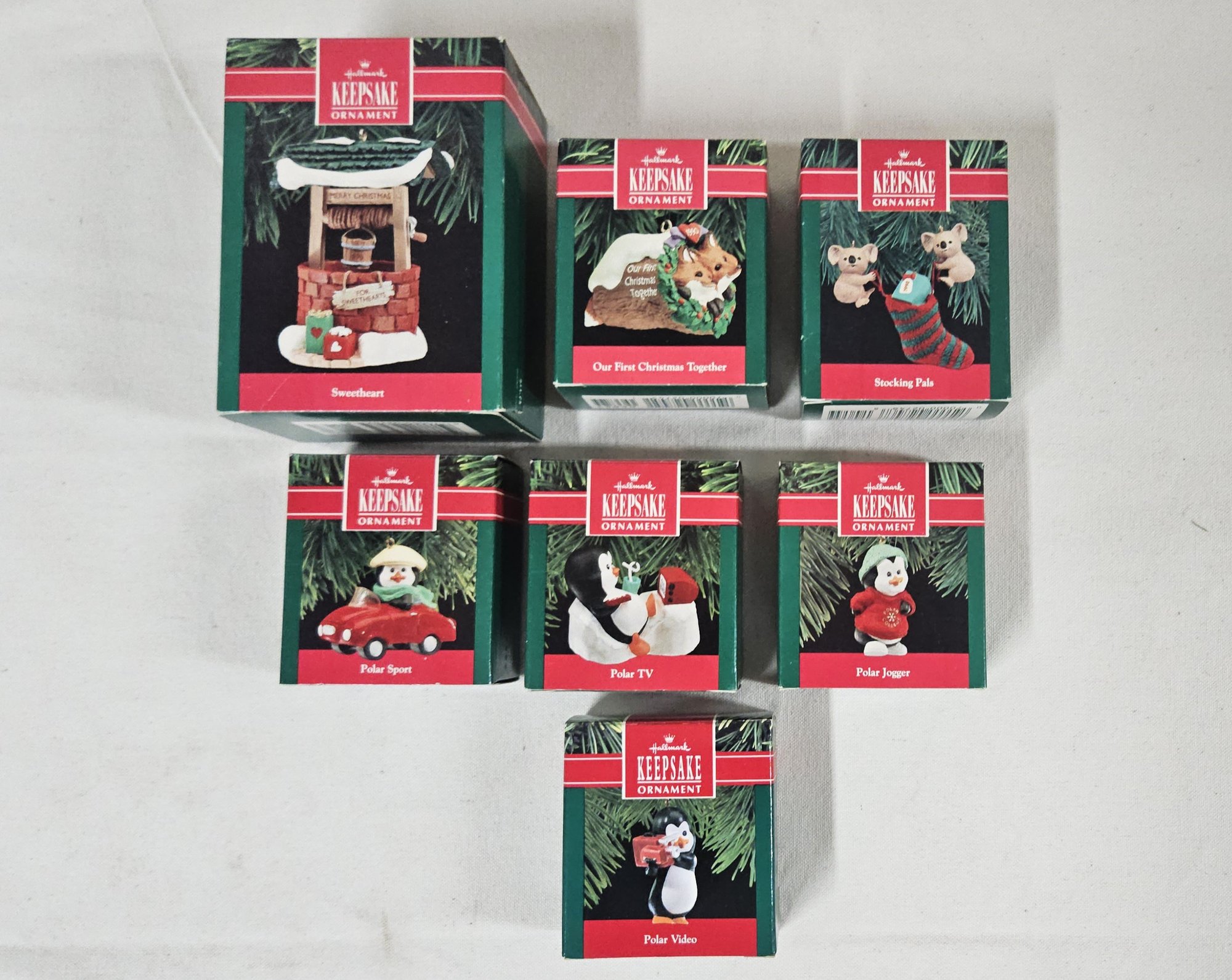 Group of ~7 assorted boxed Keepsake Ornaments including Sweetheart, Stocking Pals, Polar Sport, Polar Video, Our First Christmas Together, Polar Jogger, & Polar TV. Produced by Hallmark Cards, Inc.