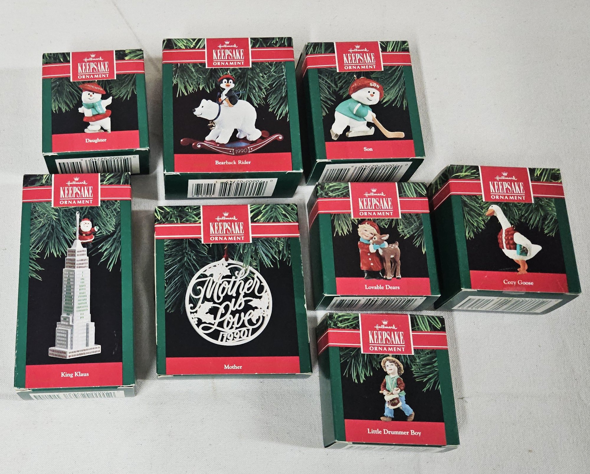 Group of ~8 assorted boxed Keepsake Ornaments including Son, Daughter, Lovable Dears, Little Drummer Boy, King Klaus, Mother, Cozy Goose, & Bearback Rider. Produced by Hallmark Cards, Inc.