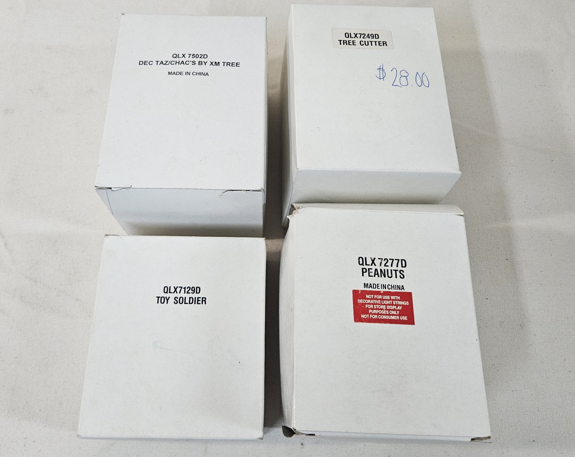 Group of ~4 boxed Keepsake Magic store display ornaments including Bringing Home the Tree, Decorator Taz, Toyland Tower, & Peanuts #5. Produced by Hallmark Cards, Inc.