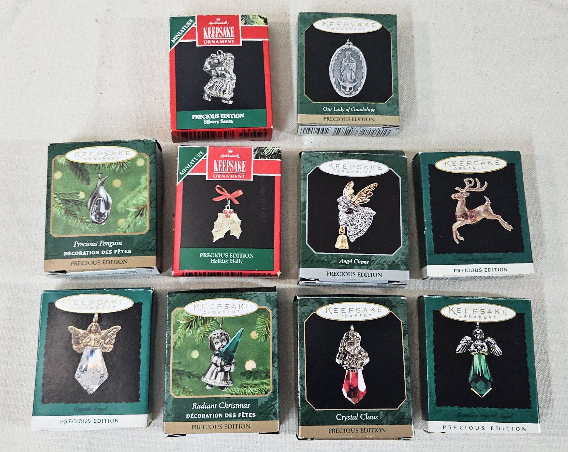 Group of ~10 assorted boxed Hallmark Keepsake Precious Edition Miniature Ornaments including Silvery Santa, Our Lady of Guadalupe, Precious Penguin, Holiday Holly, Angel Chime, Dazzling Reindeer, Crystal Angel, Radiant Christmas, Crystal Claus, & Sparkling Crystal Angel. Produced by Hallmark Cards, Inc.