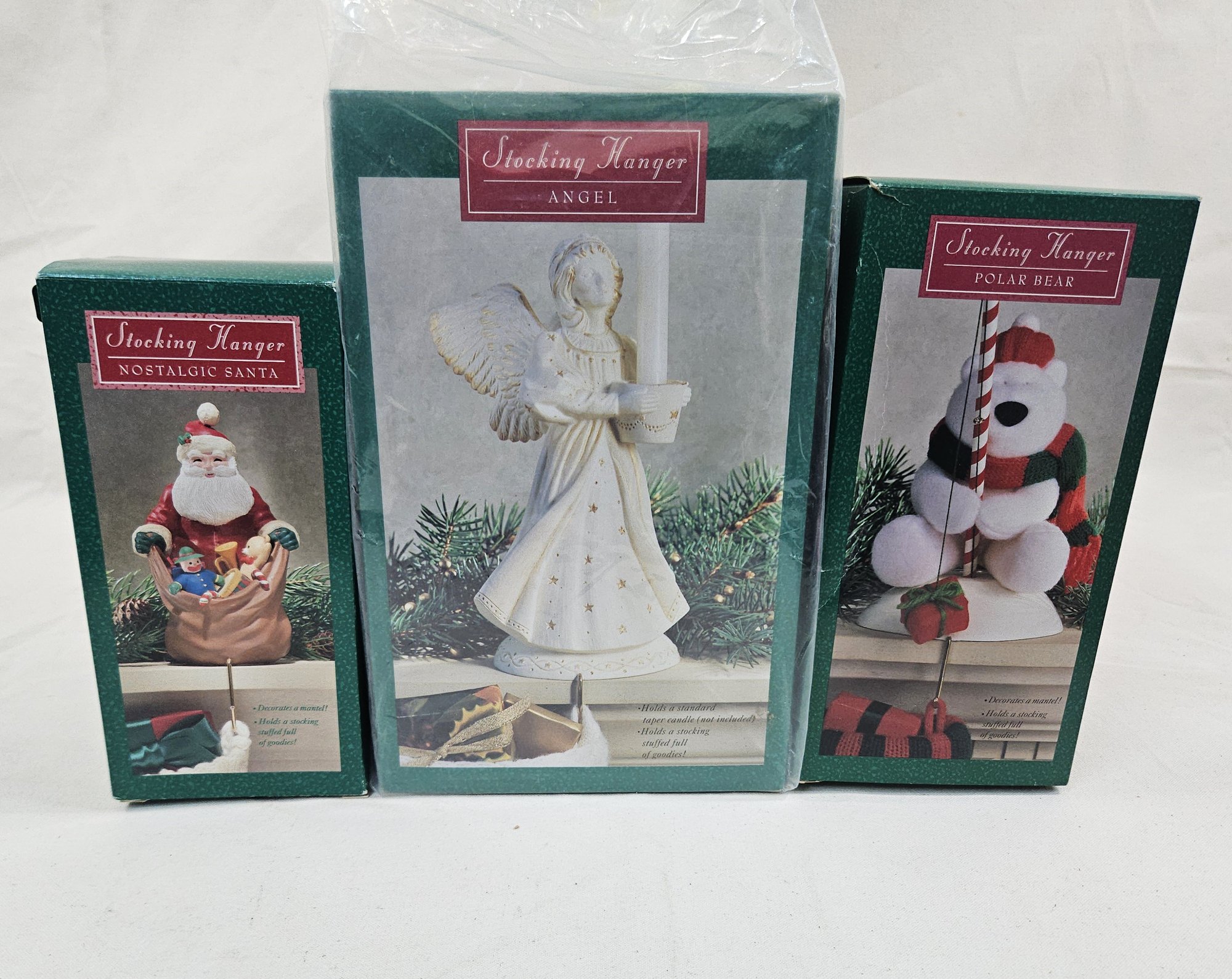 Group of ~3 assorted boxed stocking hangers including Nostalgic Santa, Polar Bear, & Angel. Produced by Hallmark Cards, Inc.