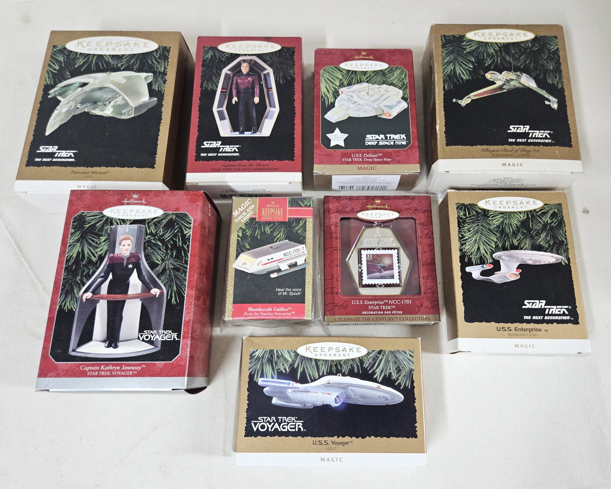Group of ~9 assorted boxed Keepsake Star Trek Ornaments including Shuttlecraft Galileo, U.S.S. Enterprise, Klingon Bird of Prey, Romulan Warbird, Captain Jean-Luc Picard, U.S.S. Voyager, U.S.S. Defiant, Captain Kathryn Janeway, & U.S.S. Enterprise NCC-1701 Stamp. Produced by Hallmark Cards, Inc.