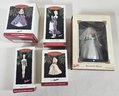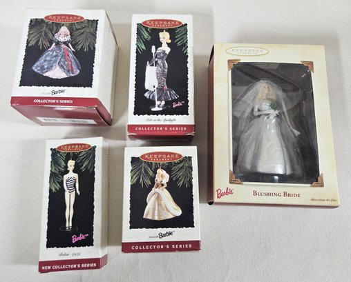 Group of ~5 assorted boxed Keepsake Collector's Series Barbie Ornaments including Barbie 1& 2, Holiday Barbie 2 & 3, and Blushing Bride. Produced by Hallmark Cards, Inc.