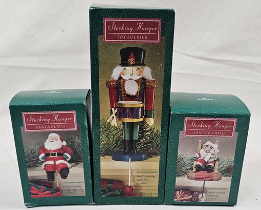 Group of ~3 assorted boxed stocking hangers including Toy Soldier, Santa & Child, & Santa Claus. Produced by Hallmark Cards, Inc.