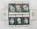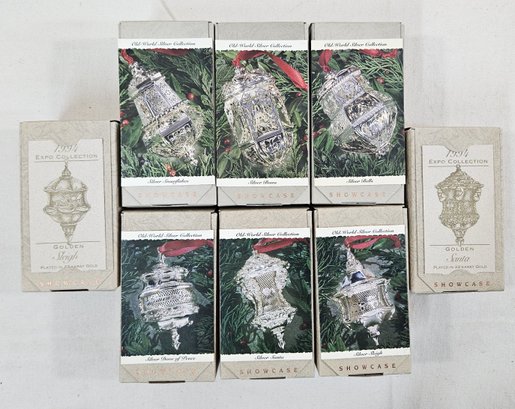 Group of ~8 assorted boxed Keepsake Showcase Folk Art Americana Collection Old-World Silver Collection including Silver Dove of Peace, Silver Santa, Silver Snowflakes, Silver Bells, Silver Bows, Silver Sleigh, 1994 Expo Collection Golden Sleigh, & 1994 Expo Collection Golden Santa. Produced by Hallmark Cards, Inc.