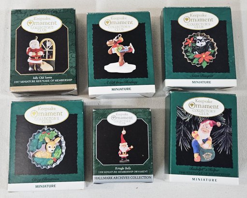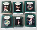 Group of ~6 assorted boxed Hallmark Keepsake Collector's Series Sky's the Limit Miniature Ornaments including Jolly Old Santa, A Gift From Rodney, Sweet Bouquet, Cozy Christmas, Kringle Bells, & Rudolph's Helper. Produced by Hallmark Cards, Inc.