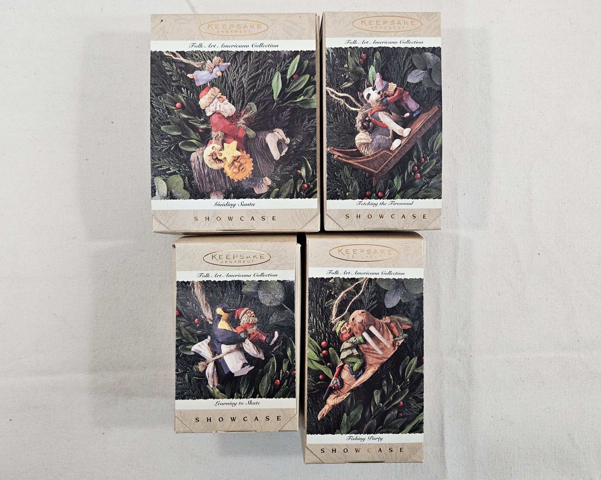 Group of ~4 assorted boxed Keepsake Showcase Folk Art Americana Collection Ornaments including Fishing Party, Learning to Skate, Fetching the Firewood, & Guiding Santa. Produced by Hallmark Cards, Inc.