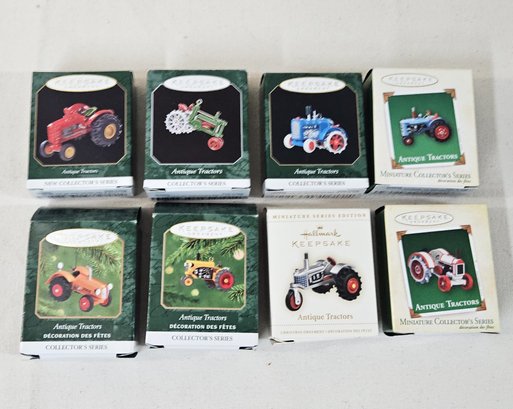 Group of ~8 assorted boxed Hallmark Keepsake Collector's Series Antique Tractors Miniature Ornaments including 1-5, 7, 9, & 10. Produced by Hallmark Cards, Inc.