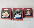 Group of ~3 boxed Keepsake Magic Ornaments including Thomas Kinkade The Warmth of Home, Snoopy Plays Santa, & Teapot Party. Produced by Hallmark Cards, Inc.