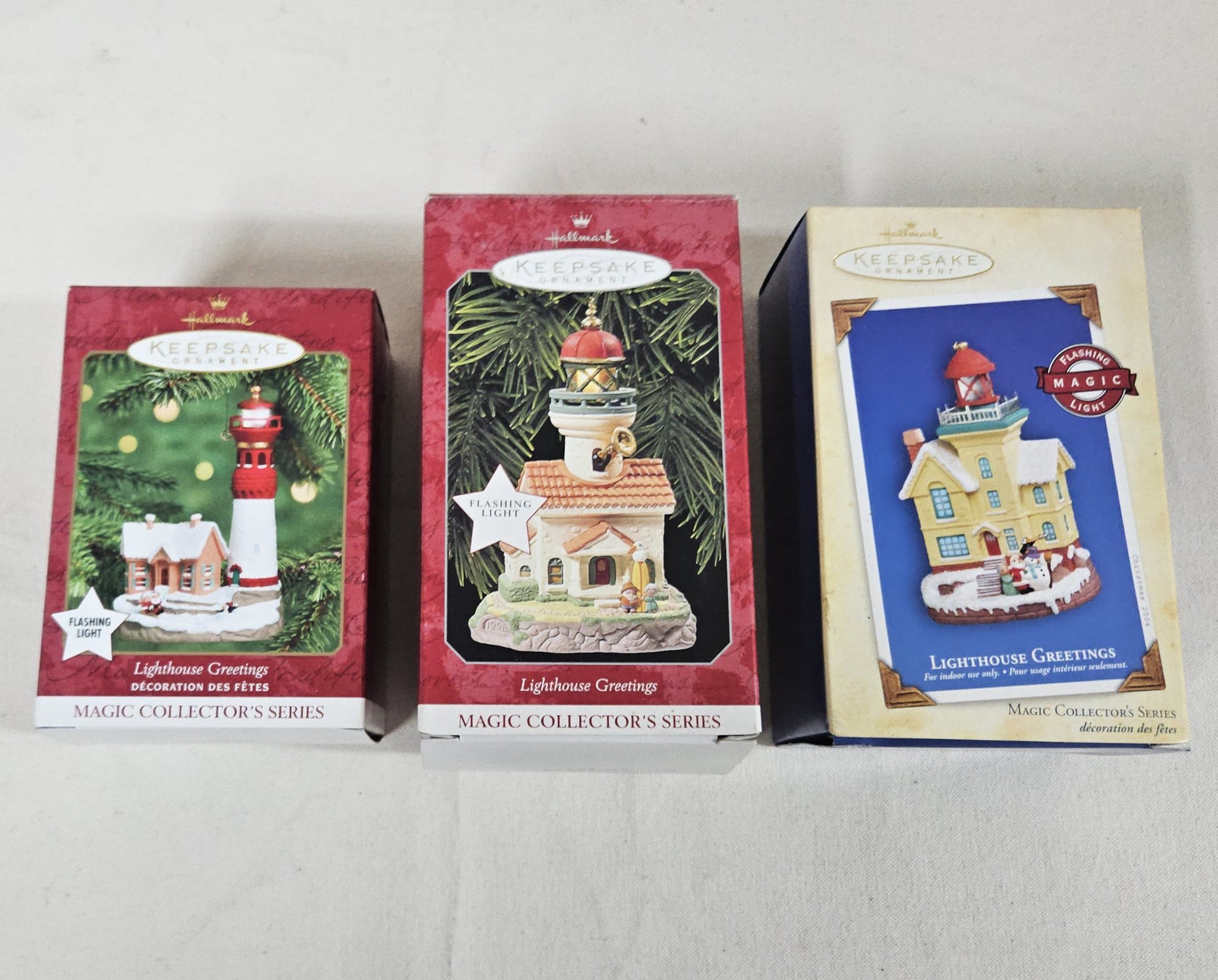 Notes: Assorted 1998-2004 Hallmark Keepsake Magic Collector's Lighthouse Greetings Series Ornaments are pre-owned showing light to minor signs of wear commensurate with age & use, ornaments retain original boxes, boxes may have some light to minor blemishes or flaws, and ornaments have no major apparent identifiable blemishes or flaws. Please review pictures.